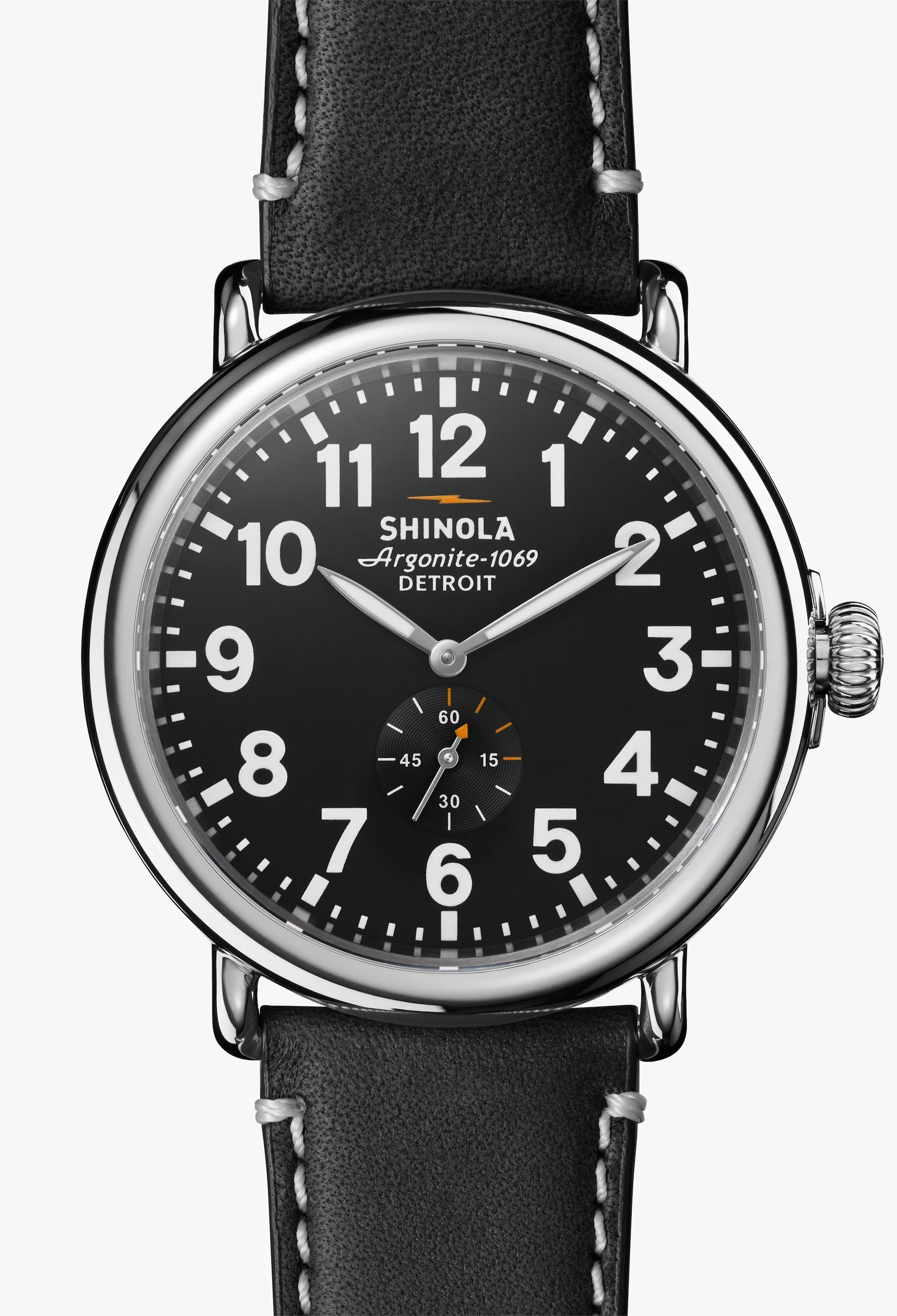 Built to last, named accordingly, this Runwell sports a supremely classic color palette. Two hands and a sub dial are driven by Shinola's Argonite 1069 high-accuracy quartz movement. Double-domed sapphire crystal protects the timepiece from scratches. With the stunning black dial, Super-LumiNova details, the shiny stainless steel, and the leather strap with striking contrast stitching, quality is this timepiece's most apparent characteristic.